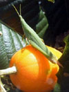 枇杷の木に絡んだ烏瓜の実の上にバッタ。地上3mくらいの高さに良く登ったと感心しました。